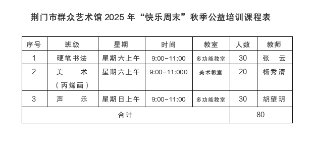 注:请显示报名成功的学员根据课程表时间按时到荆门市群众艺术馆(象山一路9号)上课。(0724-2633899、0724—2364309)